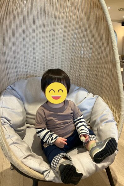 翌朝は、家族全員で食べに行きました。可愛らしい椅子もあって、