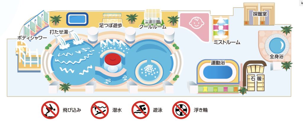大きな温浴施設には、打たせ湯、ジャグジー、水流浴、気泡浴、がありました。