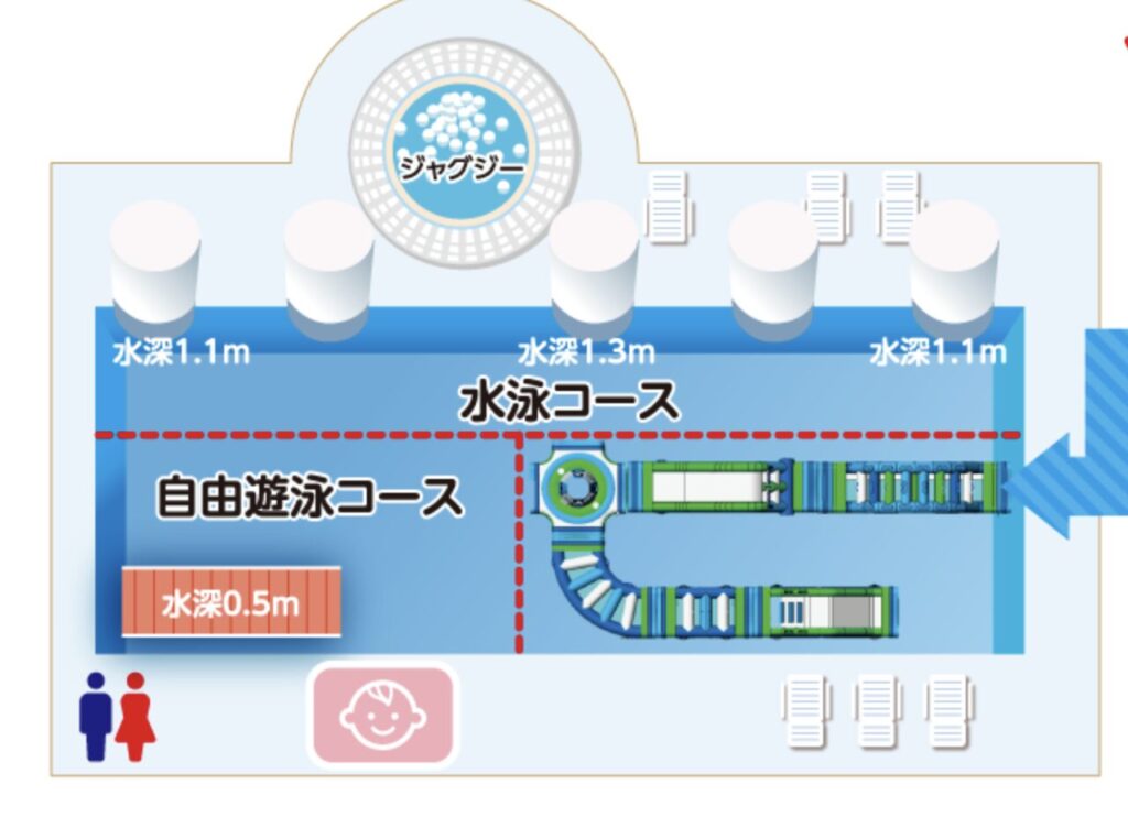 身長制限:110cm以上の子供しか利用できません。水深110cm〜130cmです。