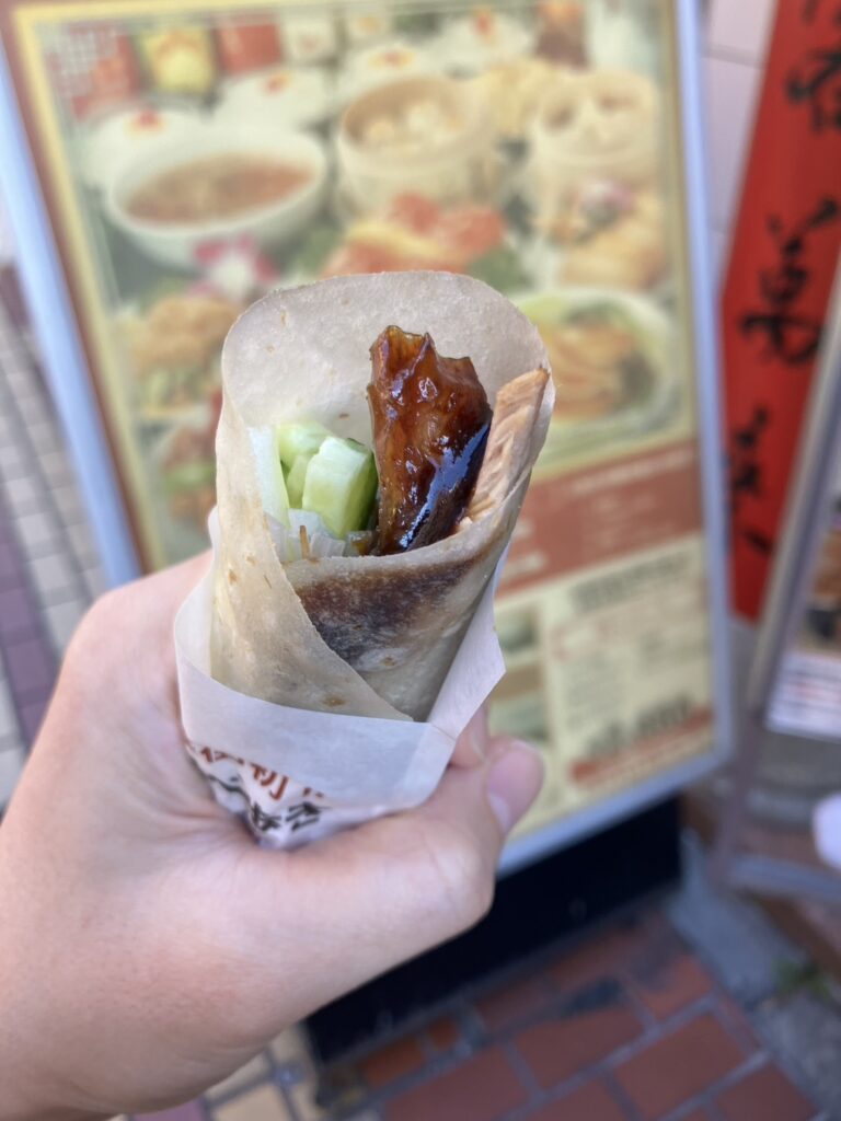 この店でオススメするのは、「北京ダック」です!何と!?持ち歩いて食べれます!
